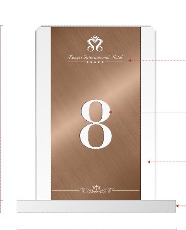 大家可以看到這個(gè)酒店餐臺(tái)座,簡單的給大家介紹下制作規(guī)范:牌上面印有酒店logo是采用絲印銀色,牌上的序號(hào)數(shù)字制作材質(zhì)是用3mm厚斜紋細(xì)拉不銹鋼,工藝上電鍍咖啡金色、文字鏤空、打磨拋光,亞克力底座使用打磨拋光制成。可以了解到一個(gè)小小餐臺(tái)座設(shè)計(jì)師也是很用心為酒店設(shè)計(jì)制作的,不僅僅要讓酒店滿足還要讓更多的客戶喜歡。